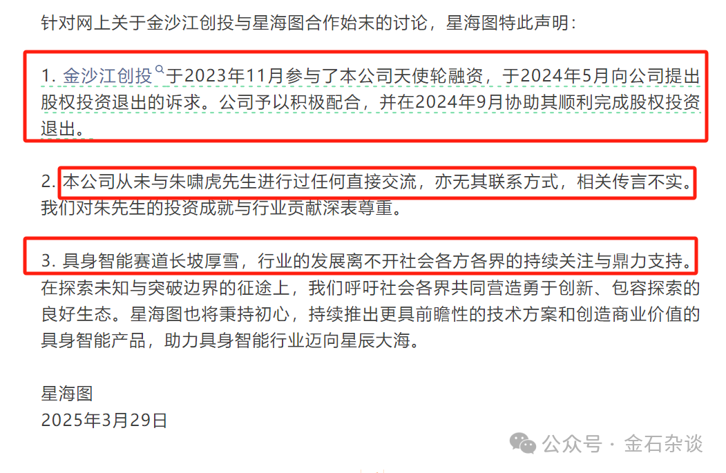 星海图表示,金沙江创投2023年11月参与天使轮,6个月就要求退出,9月顺利完全股权退出;公司从未与朱啸虎直接交流过,也没有其联系方式;具身智能赛道长坡厚雪,行业的发展离不开社会各方各界的持续关注与鼎力支持。在探索未知与突破边界的征途上,我们呼吁社会各界共同营造勇于创新、包容探索的良好生态。