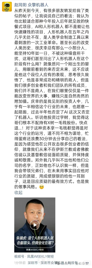 随着事情发酵,朱啸虎投资过的人形机器人企业以及其他人形机器人赛道的创始人也是怒怼朱啸虎。众擎机器人CEO赵同阳在朋友圈怒怼,且说的很难听。
