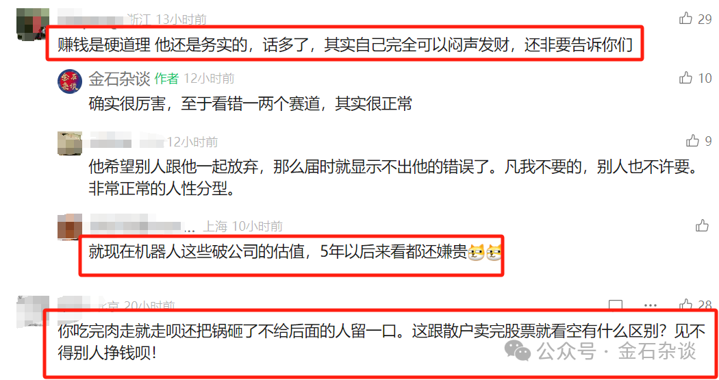 张颖继续说到:朱老板这么一番话,我就好奇以后机器人赛道的优质公司谁还会跟他聊,更用不用拿他钱。(金石翻译过来就是:朱老板,以后没人跟你玩了)